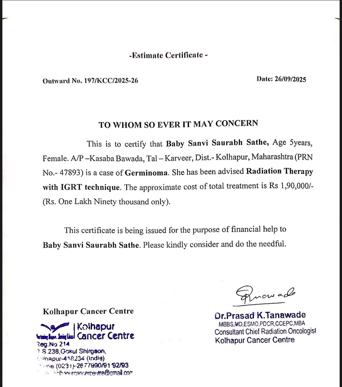 ABCD Foundation is a dedicated non-governmental organization (NGO) that has been working tirelessly for the past 8 years to improve child health and well-being across India. With a strong focus on supporting underprivileged children in medical crises, the foundation has helped countless families access critical healthcare services. Today, we are reaching out with an urgent appeal to support Baby Sanvi, a 5-year-old child from Kolhapur who is battling cancer. ABCD Foundation is committed to standing by Siyon and his family during this difficult time, but we cannot do it alone. We need your support—every donation, big or small, can help save Sanvi's life and bring hope to his loved ones.