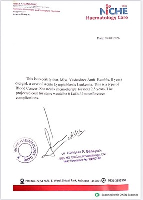 An 8-year-old child from Kolhapur is fighting one of the toughest battles of her life — blood cancer.